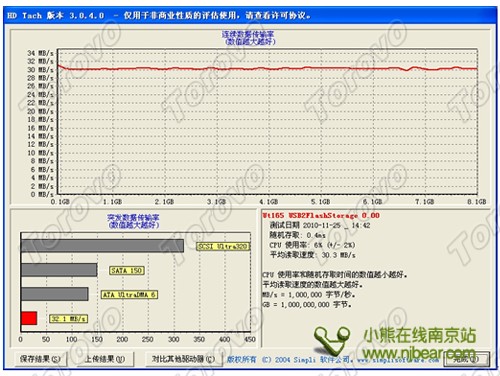HD Tach是一款小巧、使用方便、測試時間短的測試程序,它可以在短時間內測試出隨機訪問時間、讀取速率、寫入速率、突發讀取速率和CPU占用率。利用它我們還可以得到讀取性能曲線和寫入性能曲線,可以直觀的得到測試產品在數據存取過程中的數據。在這次測試中我們使用HD Tach V3.0.4.0版本。 由上圖測試數據顯示結果我們可以看出這款PNY臉譜盤(8GB)的平均讀取速度為30.3MB/s,測試曲線平穩。