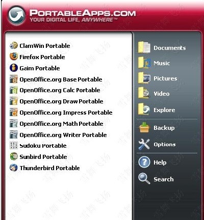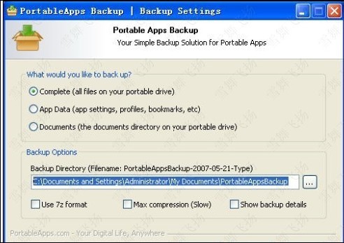 右側(cè)是功能列表,上方的Documents對應著閃存根目錄下的“Documents”文件夾;其下的“Music”、 “Pictures”、“Video”分別對應著“Documents”文件夾下的各個同名子文件夾;單擊“Explorer”可以 打開資源管理器;“Backup”是用來備份閃存里的數(shù)據(jù),點擊后出現(xiàn)“Backup files”和“Restore from backup”兩個選項。單擊“Backup files”會彈出備份向?qū)Вㄟ^該向?qū)覀兛梢詫⒄麄€閃存或者是閃存中的應用程序數(shù)據(jù) 、文檔備份起來,默認的備份目錄“C:\Documentsandettings\Administrator\MyDocuments\PortableAppsBackup”,我們可以通過向?qū)Т翱诟?改為非系統(tǒng)所在的分區(qū)。另外還可以選擇壓縮方式,以節(jié)約空間。而“Restore from backup”則是備份的逆操作,也就是還原了