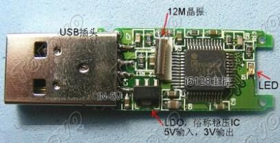 U盤的結構比較簡單,主要是由USB插頭、主控芯片、穩壓IC(LDO)、晶振、閃存(FLASH)、PCB板、貼片電阻、電容、發光二極管(LED)等組成。