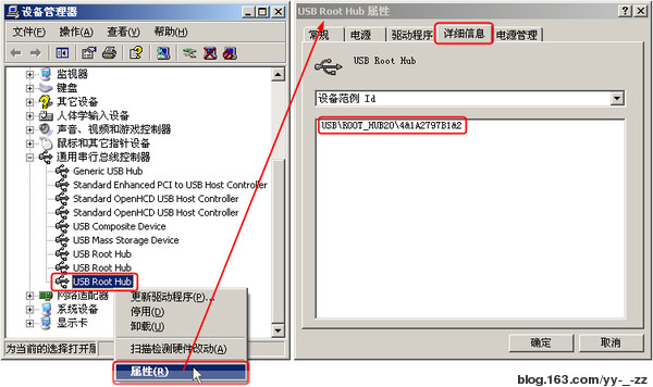 注解:上面代碼就是先實現停用USB設備再啟用。后面那一長串東西需要你自己修改,方法是在“USB Root Hub”上右擊選擇“屬性”,再選擇“詳細信息”,用“設備范例ID”替換掉上面代碼中的即可。最后要注意的是,“@”和雙引號,這可是成敗的關鍵!