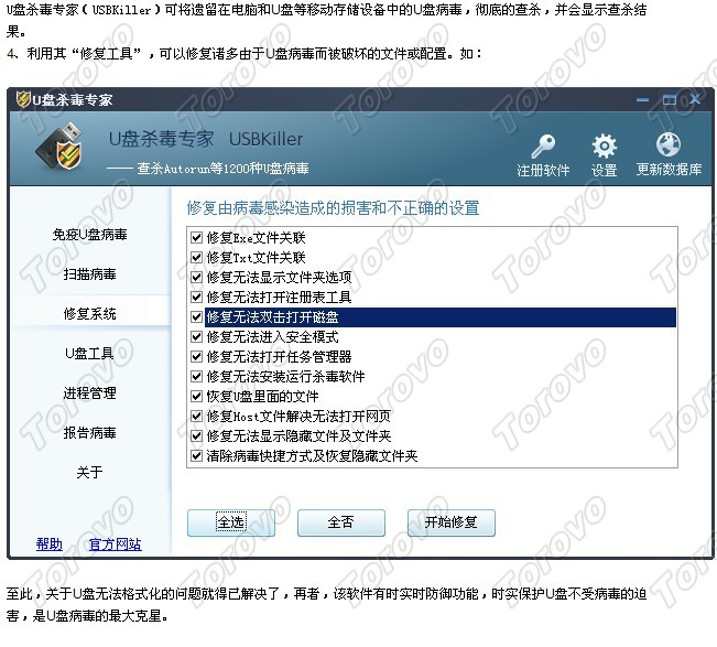 經過多方試驗研究,覺得使用U盤殺毒專家(USBKiller)是為有效,該軟件是一款國產的專業U盤病毒專殺工具,能夠輕松解決U盤無法格式化問題,并修復由病毒感染造成的損害和不準確的設置,還能夠全面掃描病毒并查殺auturun病毒,oso病毒,autorun.vbs病毒等多種U盤病毒,同時可以對U盤進行免疫,預防U盤被病毒入侵,從根本上保證U盤的使用安全。