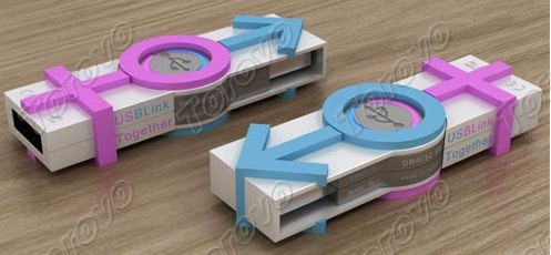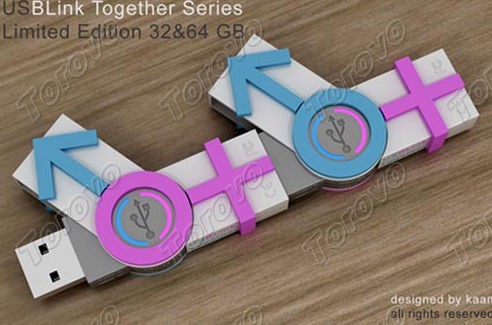 設(shè)計(jì)師Kaan Kiris以男女元素的形式設(shè)計(jì)了這款情侶優(yōu)盤,U盤的外殼上以粉色的加號(hào)、藍(lán)色的箭頭以及一個(gè)圓圈來表示,看起來非常漂亮。