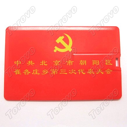 此款名片U盤是為中共北京市朝陽區崔各莊鄉第三次代表大會定制,尺寸為是83*52*1.8mm,翻轉式卡片U盤,銀行卡大小,方便攜帶。卡片U盤可個性化設計,圖案自選。容量可以做到512M,1G,2G,4G,8G,16G。采用A級閃存芯片,數據存儲持久穩定。