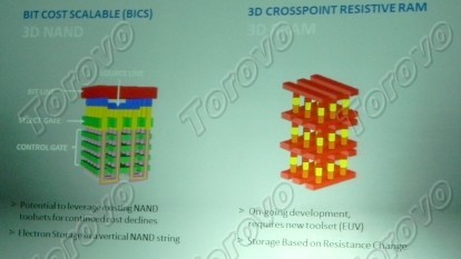 上文所說的垂直型晶體管結構NAND中起存儲作用的仍是傳統的MOS結構,而NAND閃存技術發展的下一步則是向垂直型晶體管結構中引入電阻可變型下一代存儲技術,這樣便可以將儲存芯片的位密度進一步增加。但他表示這種基于電阻可變型技術的存儲芯片必須使用EUV光刻機才能進行批量制造。