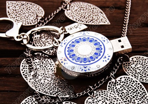 景泰藍是一種瓷銅結合的獨特工藝品,造型特異,圖案莊重,色彩富麗,具有鮮明的民族特色,備受人們喜愛。此款U盤外觀設計理念來源于景泰藍,頗具藝術色彩。白底藍花的搭配透露出細節的完美,周圍采用施華洛奇水晶,非常奢侈,將U盤與景泰藍完美結合,融入了更多的中國文化元素。