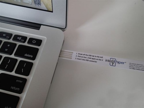 11月23日 Intellipaper公司發布了一種非常特別的USB閃存盤,它的外形就是一張紙。它是世界上第一個可以折疊,撕開和并且進行回收再利用的U盤。 使用的是由IntelliPaper公司專利的“智能紙”技術。簡單的來說,它用紙來代替閃存芯片和塑料外殼。